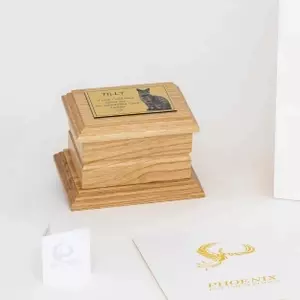 The small wooden small pet casket ( 7.5cm x 11.1cm) up to 10kg Pet - comes with a laser-engraved brass name plaque as standard.