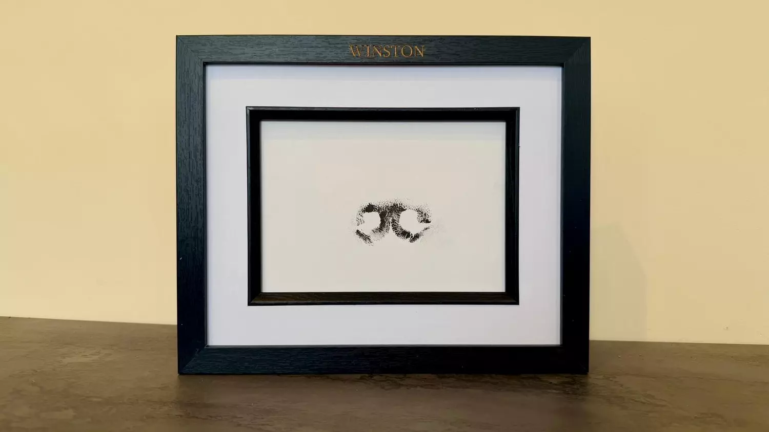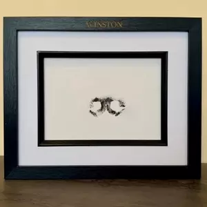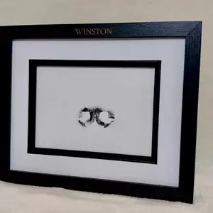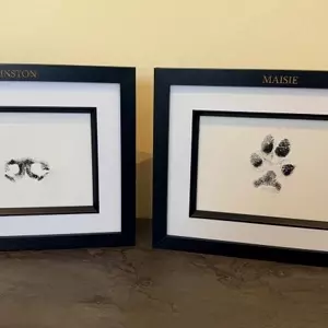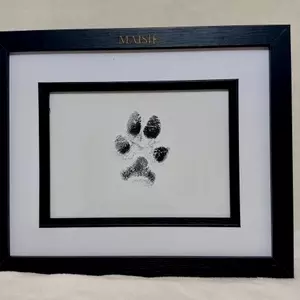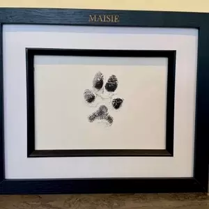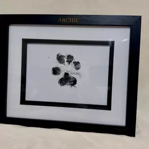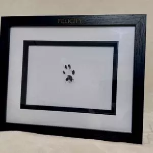 The Legacy Paw Print range offers a timeless way to honour your beloved companion. Each piece features your pet’s genuine paw impression displayed within a 7 x 5 inch black mount frame, presented in landscape only. The frame measures 27.5 cm (L) x 22.5 cm (H) x 2.7 cm (D) and is finished with your pet’s name elegantly engraved in gold across the top. Designed with both hooks for wall hanging and a strut for standing display, this distinguished keepsake preserves their memory with quiet grace.